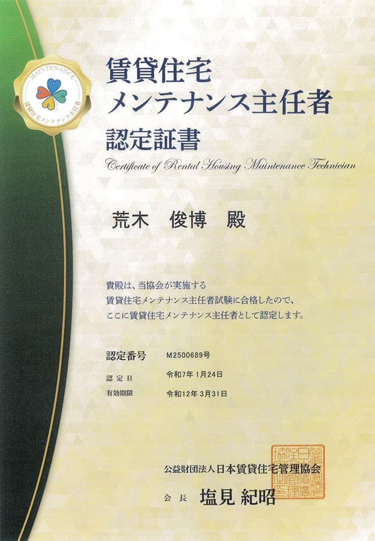| 資 格 | 宅地建物取引士 賃貸不動産経営管理士 賃貸住宅メンテナンス主任者 |